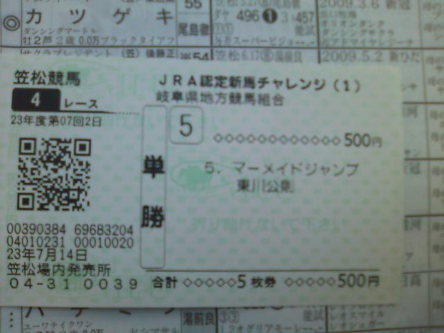 その中で、笠松では今年最初の新馬戦が組まれていたので、一番仕上がりや短距離体系っぽい5番に応援馬券^^b